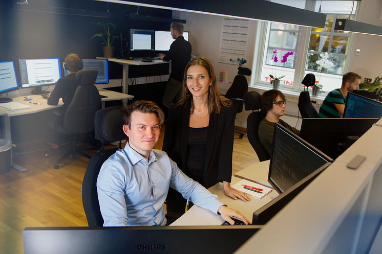 Magda og Koenrad er henholdsvis UX-utvikler og Systemutvikler i Trainor. Her i kontormiljøet i Team Digital.