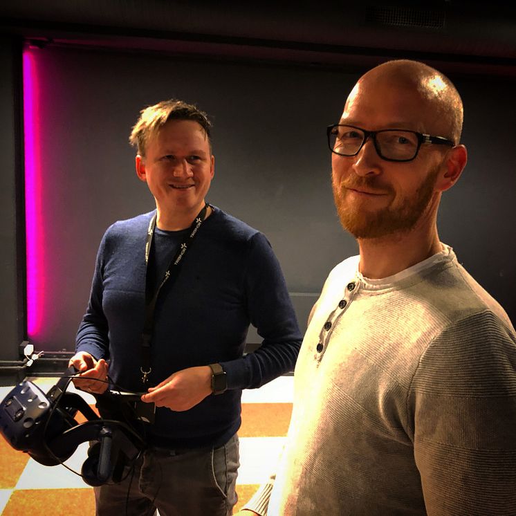 Trond Skår (til høyre) designer e-læringskurs for Trainor. Her med teamleder Kåre Vegar Sund i Trainors VR-studio.