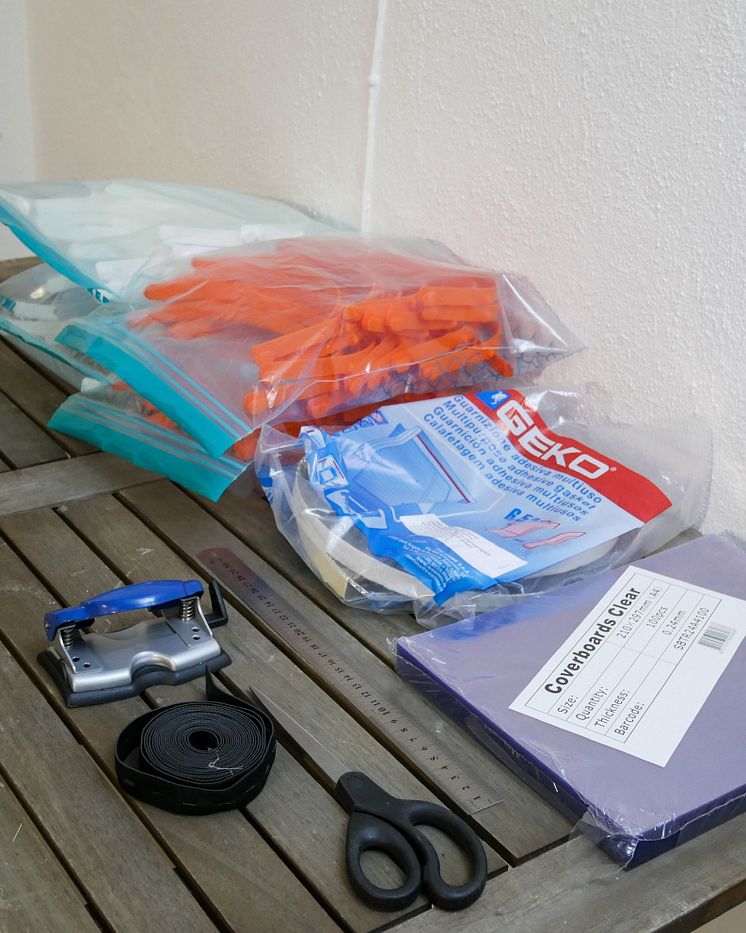 Dette trenger du: 3D-printet ramme, overhead-ark, knappehullstrikk, skumlist, hullmaskin, saks, linjal.
