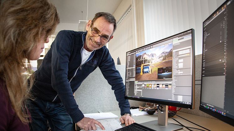 Produktansvarlig Steinar Nilsen gleder seg over å se 3D spillutvikler Amanda Westrum van Tils levendegjøring av arbeidssituasjoner han kjenner seg igjen i. Foto: Trainor AS
